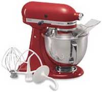 You Save : 14% KitchenAid KSM150PSER Artisan Series 5-Quart Mixer, Empire Red KitchenAid's Artisan stand mixer is a substantial piece of equipment: 325 watts of mixing power make child's play of creaming butter, kneading dough, and whipping cream. The kid in you will appreciate how quick and easy it is to mix up a batch of cookie dough. This model comes with three attachments: a flat beater for making batter, meat loaf, and all textures in-between; a wire whip for egg whites, mayonnaise, and more air-infused creations; and a hook for mixing and kneading yeast doughs. All three are solidly constructed and easily secured to the beater shaft with a simple twist. This model also includes a pouring shield for guiding ingredients to their proper destination, and the bowl itself locks tight to the base. Standing about 15 inches high, jutting out a foot, and weighing more than a grown woman's bowling ball, this stand mixer isn't the sort of appliance you'll wipe down and put away. Better to find a square foot of free counter space for easy access; besides, this machine is as pretty as it is rugged.